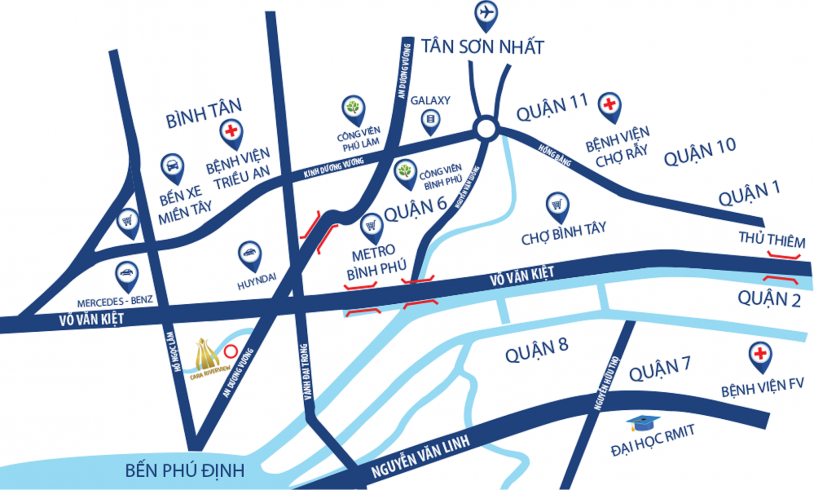 Căn hộ Cara Riverview nằm ngay mặt tiền của giao lộ An Dương Vương và Võ Văn Kiêt. Tạo điều kiện kết nối nhanh đến các tuyến đường trong thành phố: Đại lộ Đông Tây vào quận 1, quận 5, quận 4, quận 3, quận 6, quận 7 chỉ mất khoảng 5 đến 30 phút